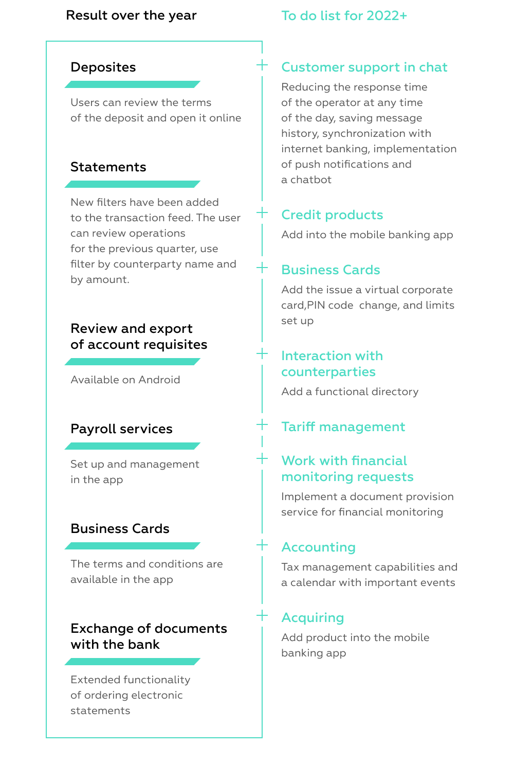 The research helped the client identify new areas for growth, reassess prioritization within the existing backlog, and begin working on them. Some of the recommendations turned out to be unique. For example, the task of developing the online chat was not in the immediate plans of the Alfa-Bank Belarus team, but after the audit, it became one of the main priorities. In larger areas, we assisted with decomposition. For example, projects related to loans and deposits were already roughly planned, but the audit helped identify and prioritize specific tasks.