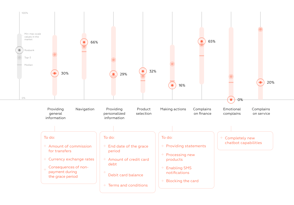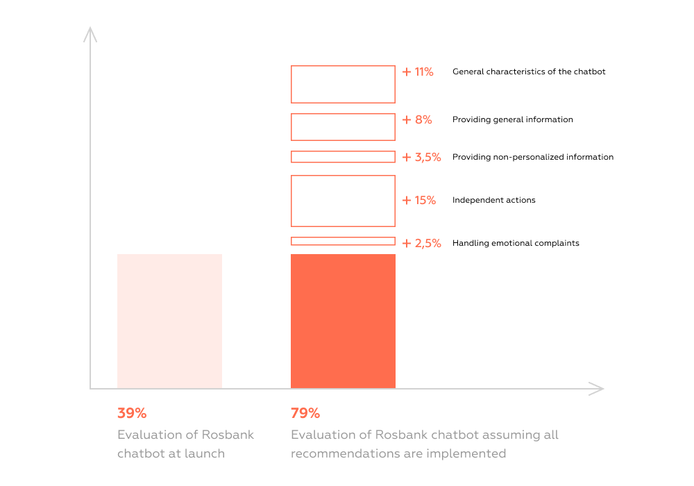 To help the bank achieve these goals, we analyzed all strengths and areas for growth and provided 67 recommendations. Fully implementing these recommendations, according to the projected benchmark, should double the client's chatbot rating, allowing it to reach the top 2 market leaders. More details in this case study.