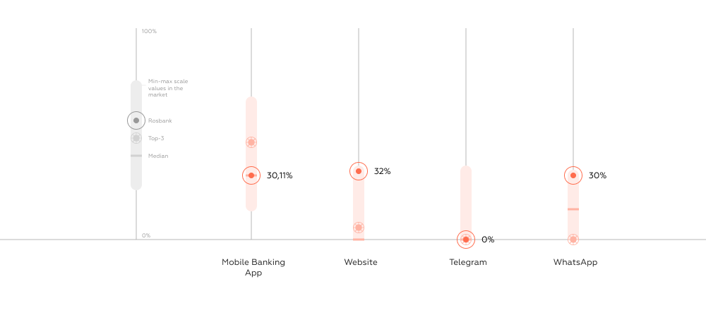 The largest banks in the region have focused primarily on developing virtual assistants within mobile apps, with less emphasis on other channels. In this context, the client's bank stood out: its bot was equally developed across all channels. In the app, it handled requests at an average market level and ranked sixth out of 11.