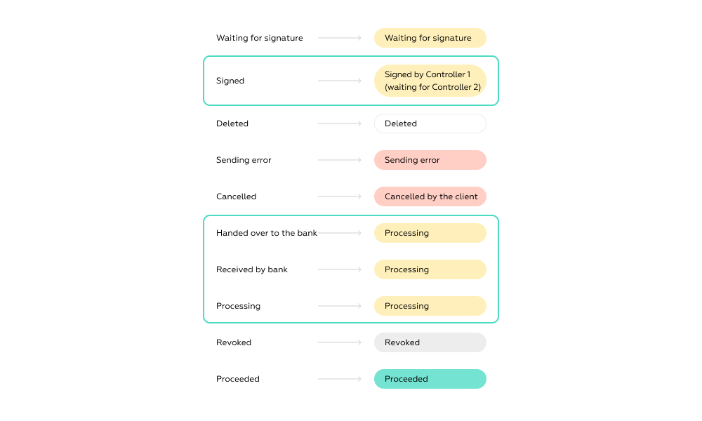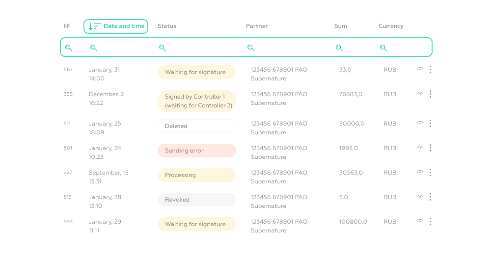 The status wording should be informative so that the financial controller can immediately determine what the problem with the payment is. The payment search bar and column filters also speed up user work in the interface. This solution was implemented in the client's personal account by the end of the project.