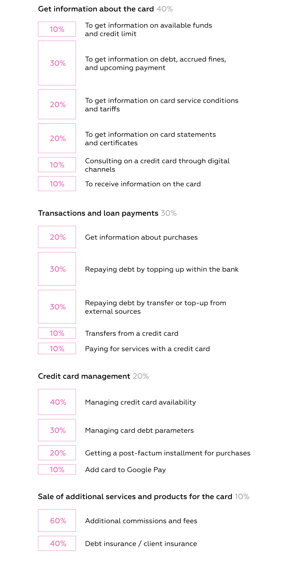 From more than 300 identified practices, we selected four examples demonstrating how UX can educate credit card holders on proper usage and motivate them to make purchases more frequently: explaining the specifics of the product, reminding about mandatory payments, reducing user anxiety, and timely transferring funds to the credit card.