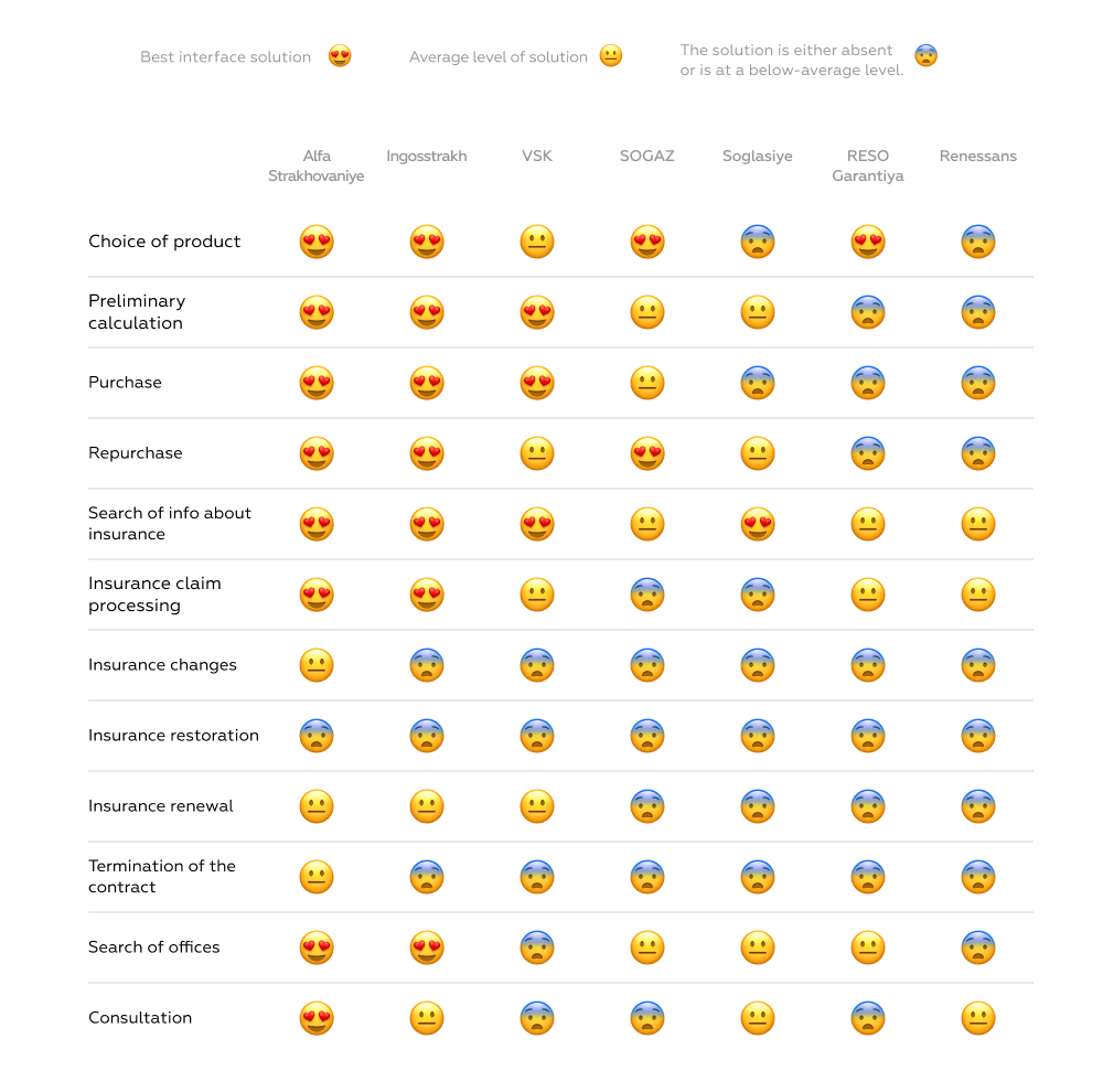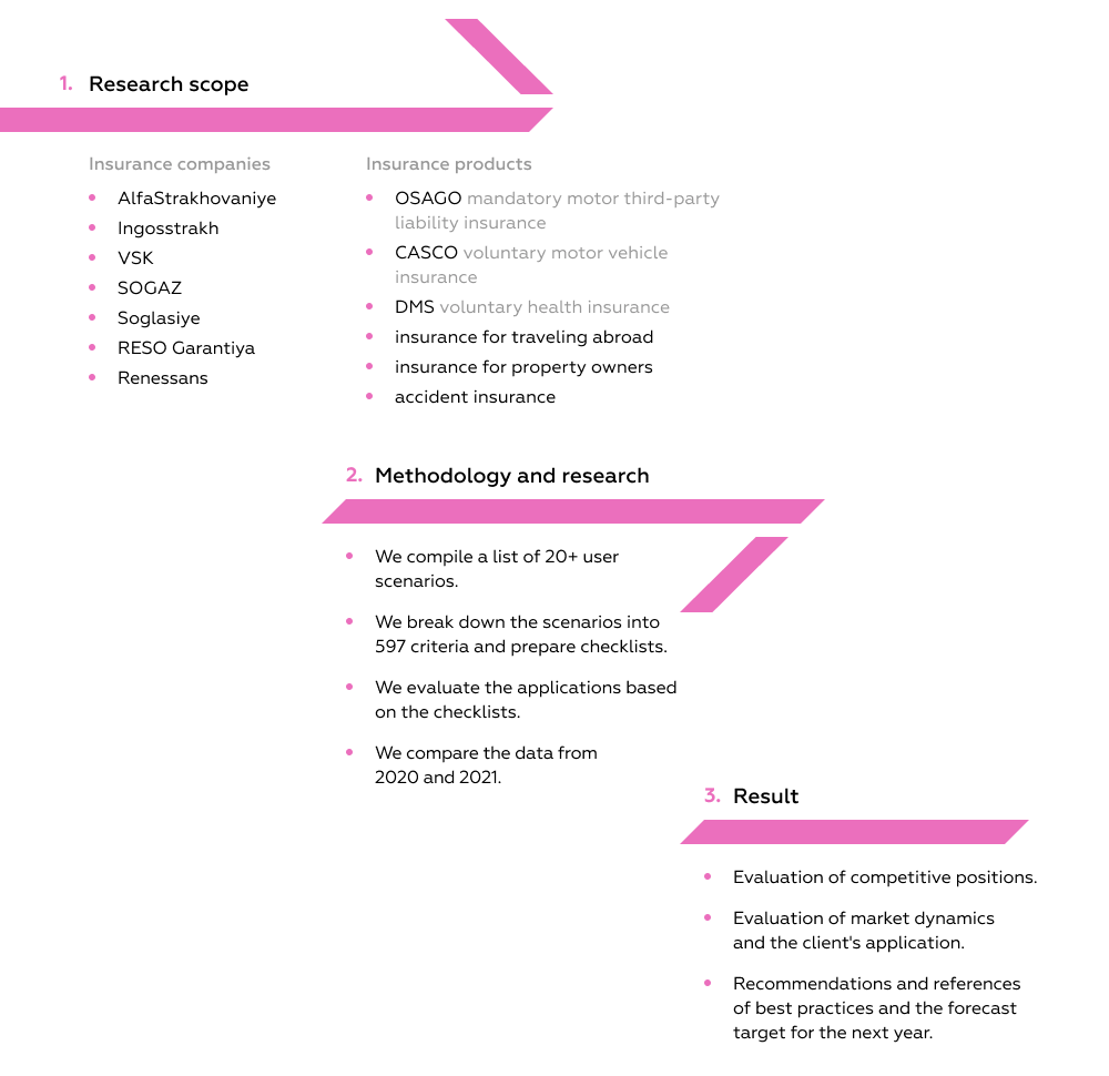 Together with the client, we defined the scope of the research, which included mobile applications of seven leading insurance companies on the market and the six most popular insurance products.