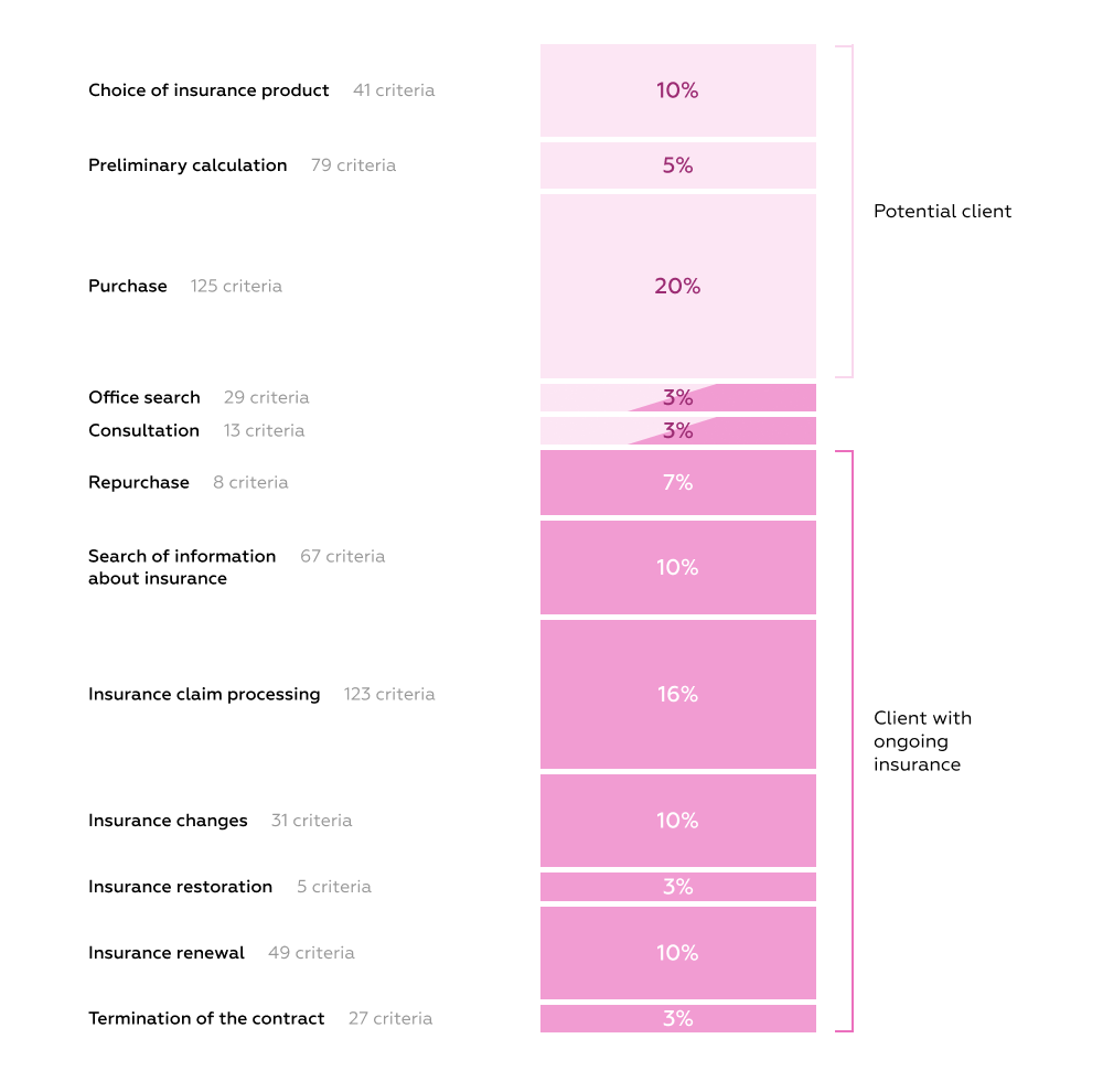 The main areas for growth are in tasks related to preliminary calculation, product purchase, claims processing, and policy renewal. Some user scenarios are not available in the application at all, for example, policy reinstatement or termination.