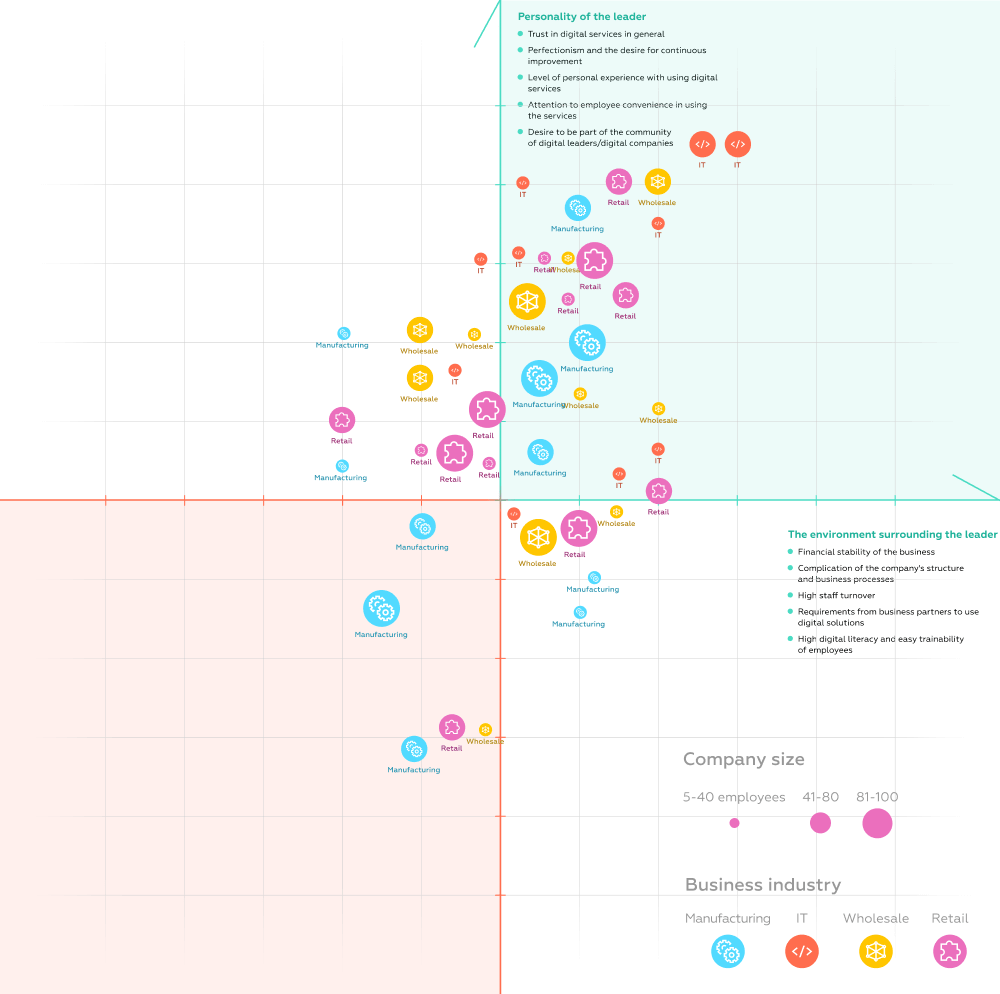 Vertical axis - characteristics of the leader's personality and their readiness for digitalization. The higher the profile on the map, the greater the likelihood of the leader implementing digital services.