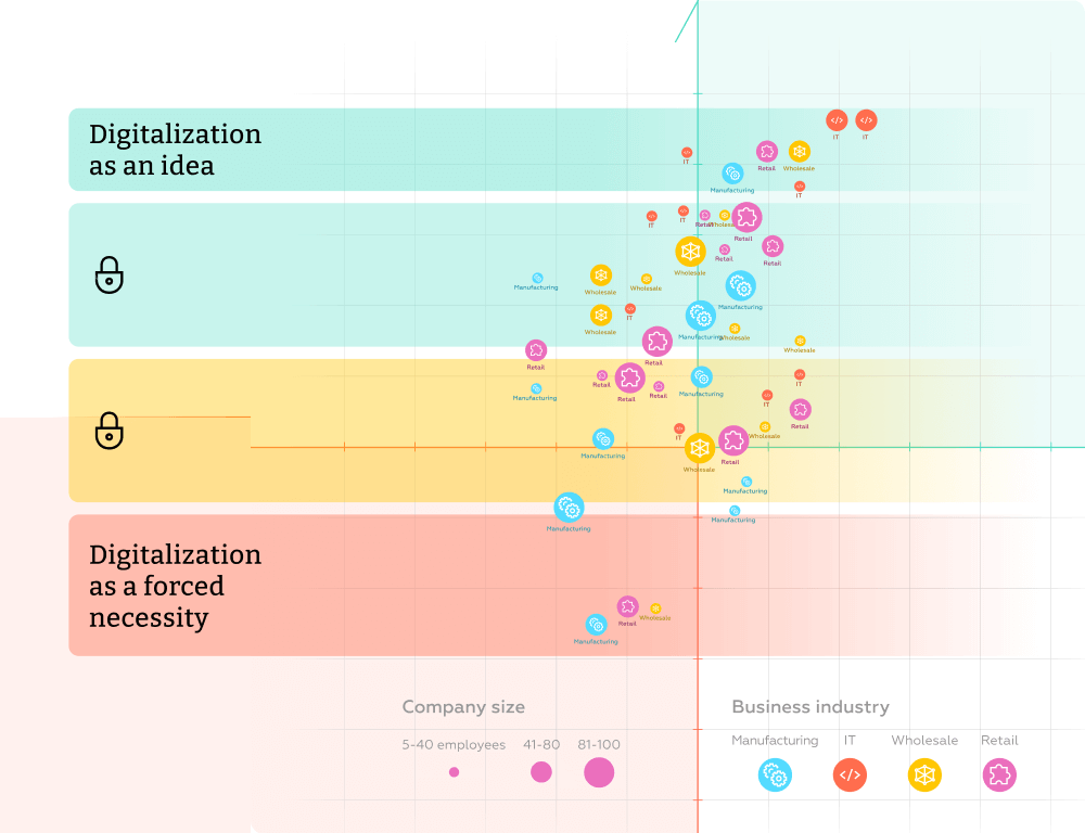 The research results are presented in the form of a digitalization map - a coordinate system where all respondents, i.e., managers of small and medium-sized businesses in European country, are located. The analysis of collected data revealed that two factors have the most significant influence on a company's digitization: the external environment and the personality of the leader. These factors have a stronger impact than industry affiliation, and they form the basis of the map.